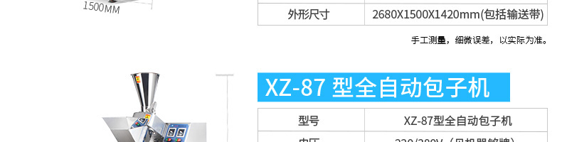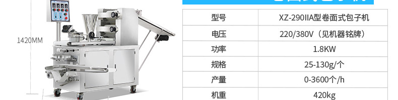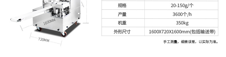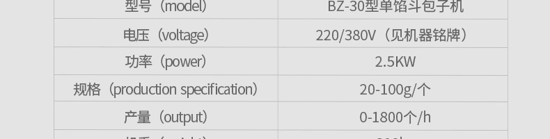 名稱(chēng)BZ-30型單餡斗包子機(jī) 電源220/380V(見(jiàn)機(jī)器名牌) 功率2.5kw 產(chǎn)量1800個(gè)/小時(shí) 尺寸1440*680*1470mm 重量300kg 規(guī)格25-100克/個(gè) 其他