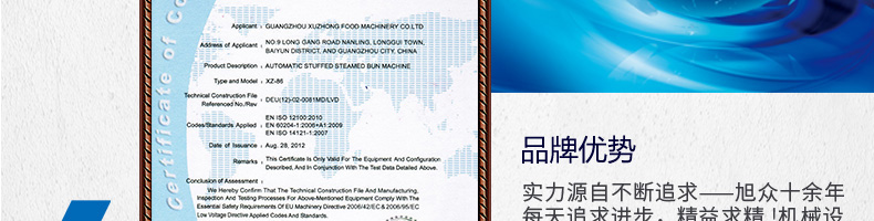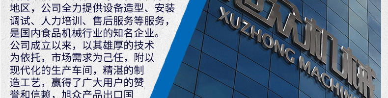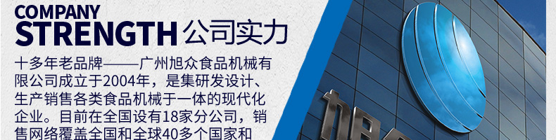 廣州旭眾食品機(jī)械有限公司是一家集科研開(kāi)發(fā),生產(chǎn)設(shè)計(jì),營(yíng)銷(xiāo)服務(wù)為一體的現(xiàn)代化生產(chǎn)企業(yè)?,F(xiàn)代化生產(chǎn)車(chē)間,精湛制造技術(shù),所產(chǎn)機(jī)械歷經(jīng)市場(chǎng)重重考驗(yàn),不斷贏得海內(nèi)外客戶(hù)的贊譽(yù)。