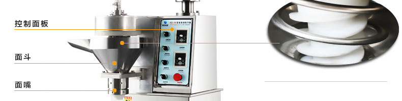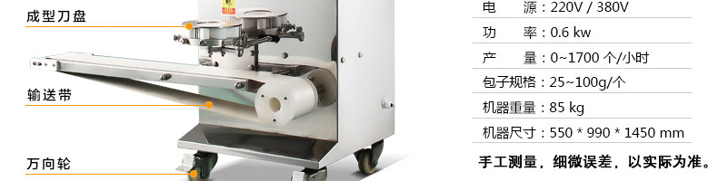 名稱XZ-10型全自動包子機 電源220/380V(見機器名牌) 功率0.6kw 產量0-1700個/小時 尺寸550*900*1450mm(包括輸送帶) 重量85kg 規(guī)格25-100克/個 其他