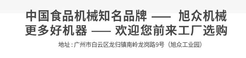 廣州旭眾食品機械有限公司是一家集科研開發(fā),生產(chǎn)設(shè)計,營銷服務(wù)為一體的現(xiàn)代化生產(chǎn)企業(yè)?,F(xiàn)代化生產(chǎn)車間,精湛制造技術(shù),所產(chǎn)機械歷經(jīng)市場重重考驗,不斷贏得海內(nèi)外客戶的贊譽。