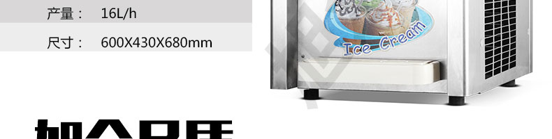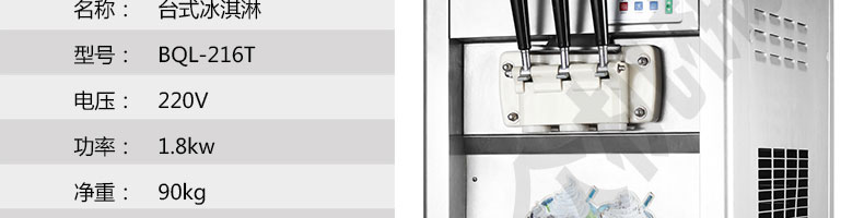 名稱BQL-216T臺(tái)式冰淇淋機(jī) 電源220V 功率1.8kw 產(chǎn)量16L/h 尺寸600*430*680mm 重量92kg 規(guī)格 其他