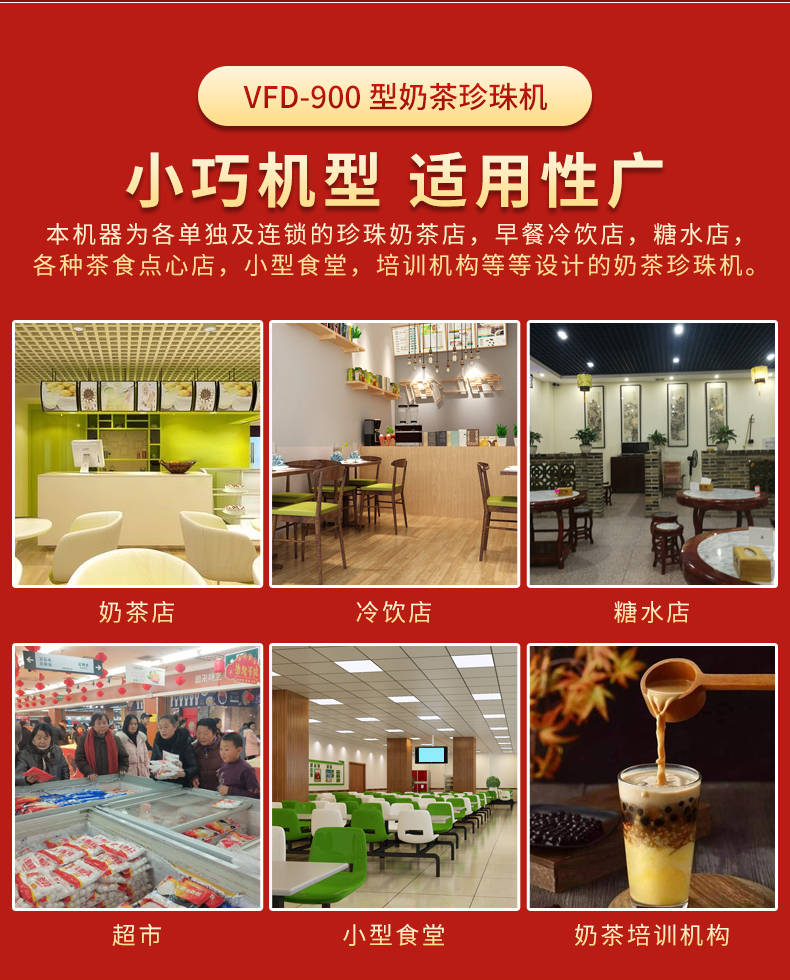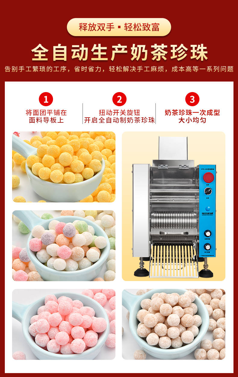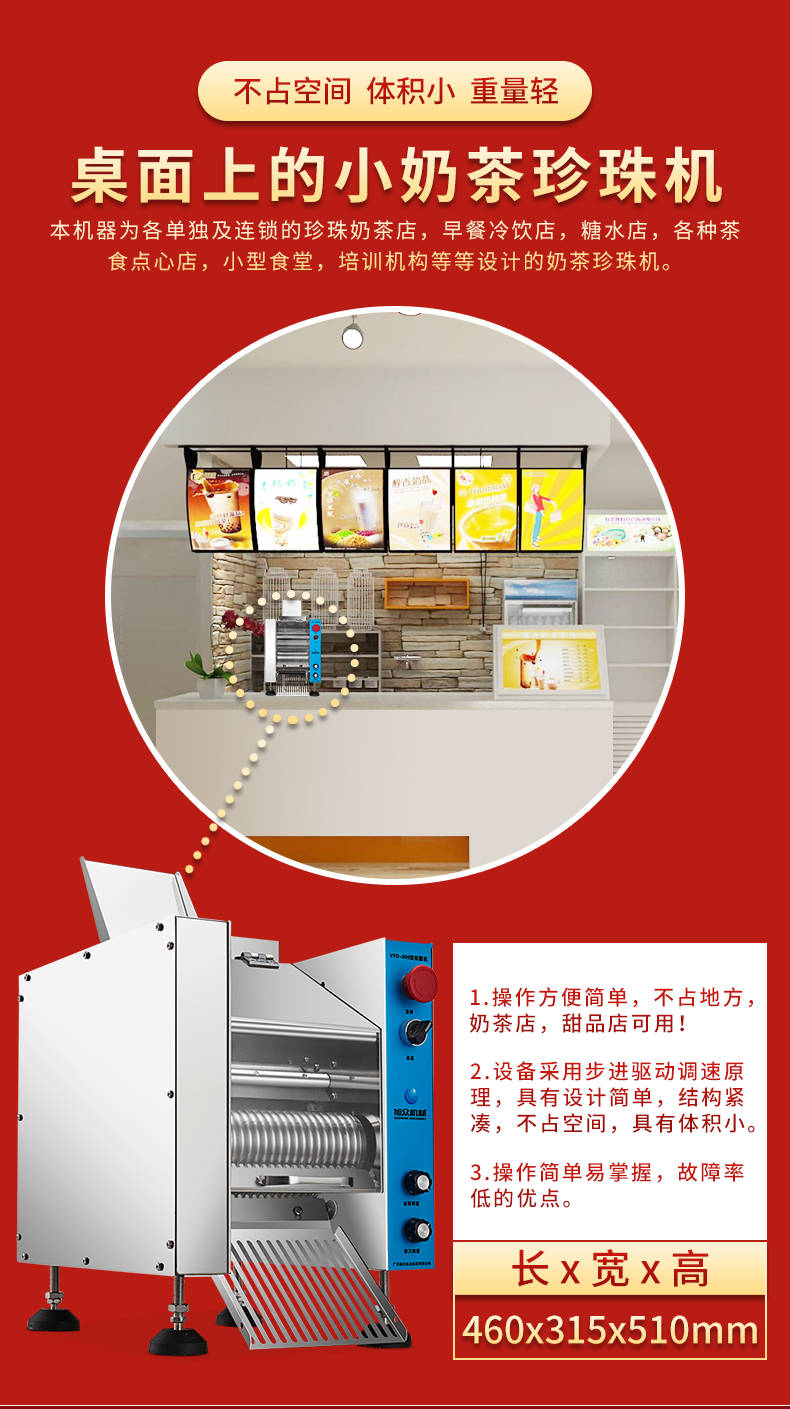 VFD-900珍珠奶茶機(jī),奶茶店、甜品店可用??缮a(chǎn)奶茶珍珠,果蔬圓子,無餡湯圓,水晶湯圓,各種芋圓。不占空間、體積小、重量輕,桌面上的小奶茶珍珠機(jī)。告別手工繁瑣的工序,省時(shí)省力,輕松解決手工麻煩,成本高等一系列問題
