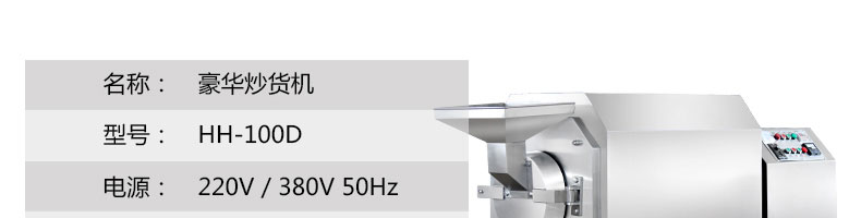 名稱豪華型100D炒貨機 電源220/380V(見機器銘牌) 功率11kw 產(chǎn)量60-100斤/次 尺寸1650*730*1250mm 重量90kg 規(guī)格 其他