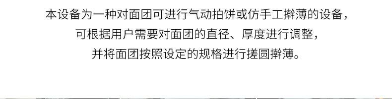 XZ-150型搟薄機(jī),為一種對(duì)面團(tuán)可進(jìn)行氣動(dòng)拍餅或仿手工搟薄的設(shè)備,可根據(jù)用戶需要對(duì)面團(tuán)的直徑、厚度進(jìn)行調(diào)整并將面團(tuán)按照設(shè)定的規(guī)格進(jìn)行搓圓摔搟薄。