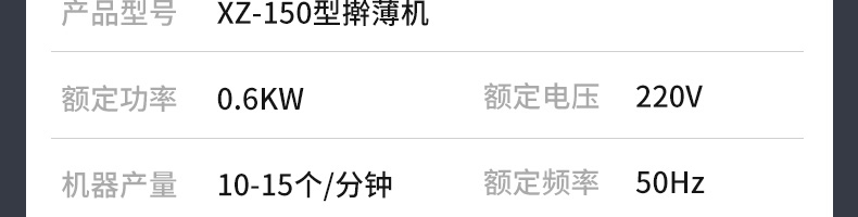 名稱XZ-150型搟薄機(jī) 電源220V 功率0.6KW 產(chǎn)量10-15個(gè)/分鐘 尺寸1720X800X1050mm 重量請(qǐng)咨詢銷售員 規(guī)格50-170克/個(gè) 其他額定頻率:50Hz