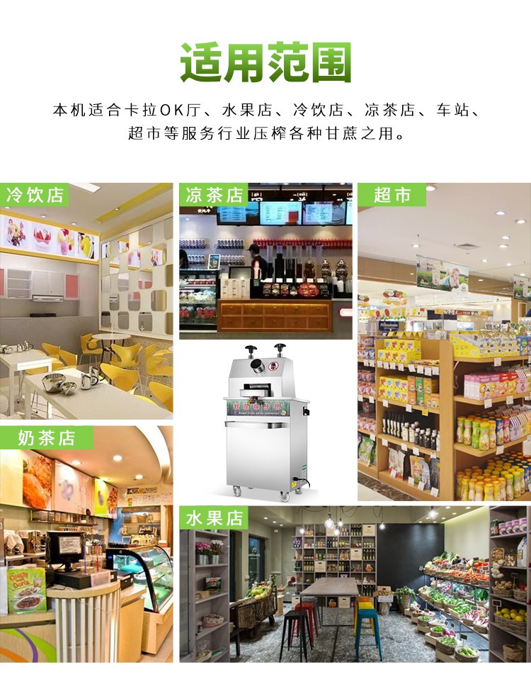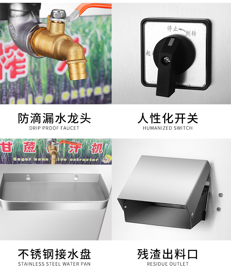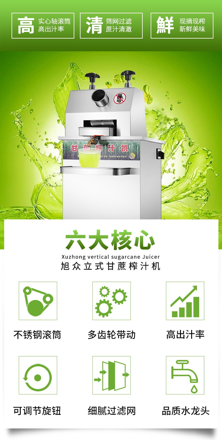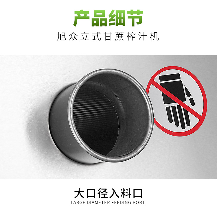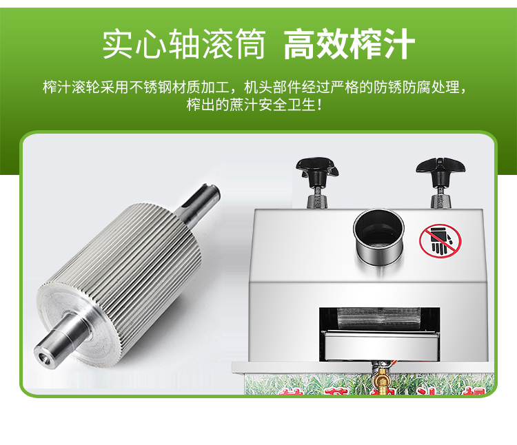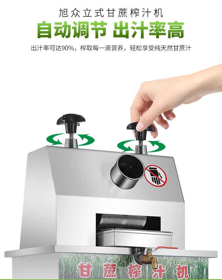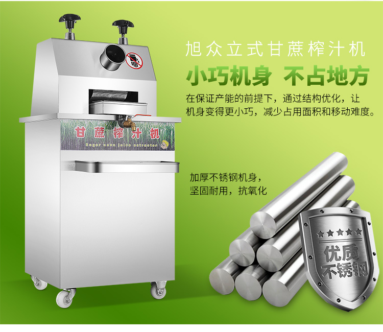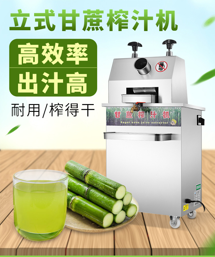 立式甘蔗機,該機采用不銹鋼材質(zhì)加工,機頭部件都經(jīng)過嚴(yán)格的防銹仿腐蝕處理,整機采用全封閉結(jié)構(gòu),可內(nèi)置蔗渣桶,保證渣汁不外泄,安全、干凈、衛(wèi)生。 適合賓館、卡拉OK廳、水果店、冷飲店、涼茶店、車站、超市等服務(wù)行業(yè)壓榨各種甘蔗之用。