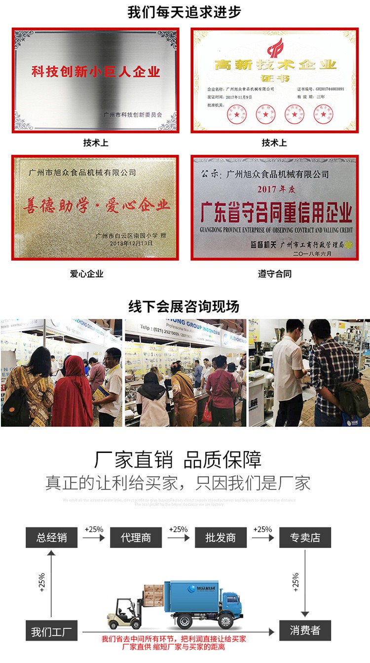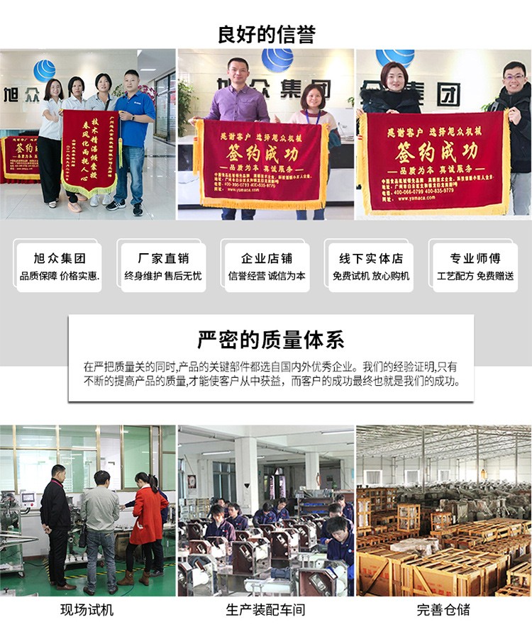廣州旭眾食品機械有限公司是一家集科研開發(fā),生產(chǎn)設(shè)計,營銷服務(wù)為一體的現(xiàn)代化生產(chǎn)企業(yè)。現(xiàn)代化生產(chǎn)車間,精湛制造技術(shù),所產(chǎn)機械歷經(jīng)市場重重考驗,不斷贏得海內(nèi)外客戶的贊譽。