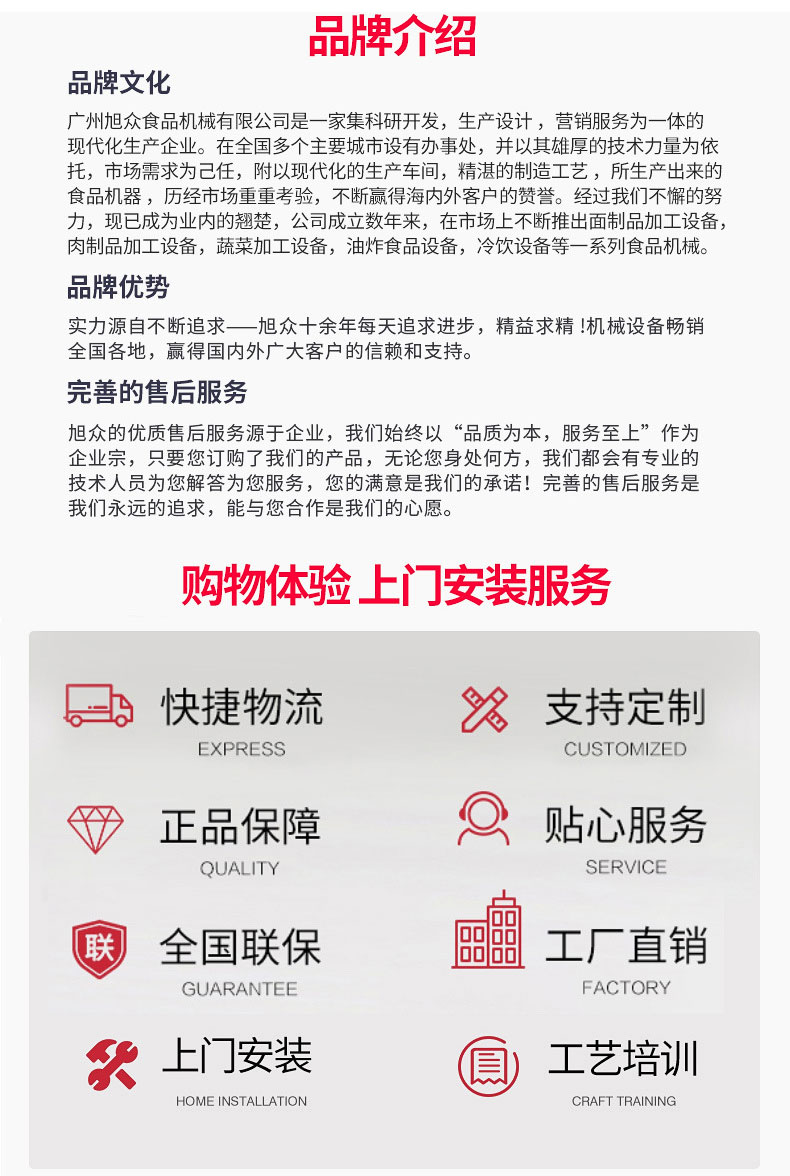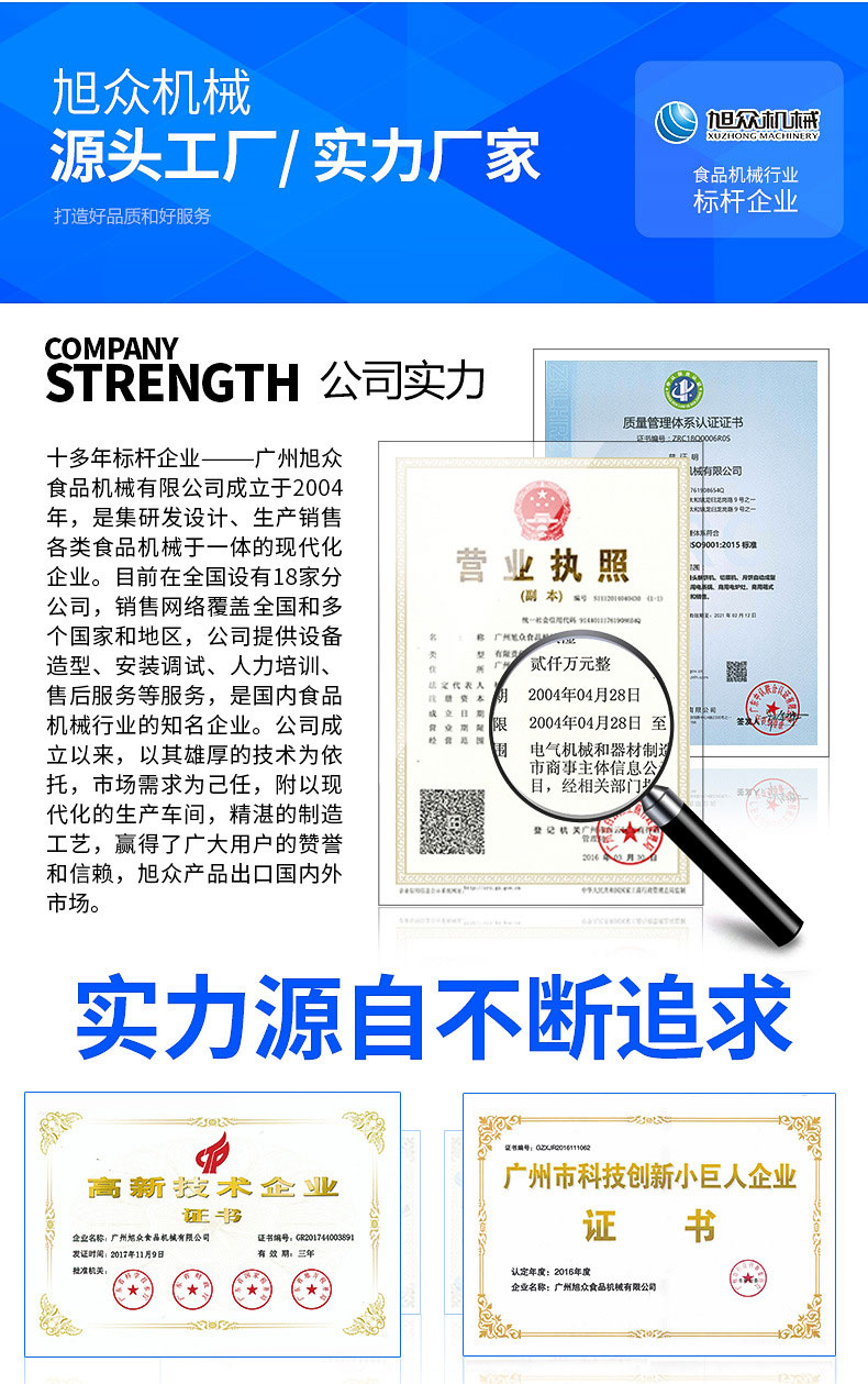 廣州旭眾食品機(jī)械有限公司是一家集科研開(kāi)發(fā),生產(chǎn)設(shè)計(jì),營(yíng)銷(xiāo)服務(wù)為一體的現(xiàn)代化生產(chǎn)企業(yè)?,F(xiàn)代化生產(chǎn)車(chē)間,精湛制造技術(shù),所產(chǎn)機(jī)械歷經(jīng)市場(chǎng)重重考驗(yàn),不斷贏得海內(nèi)外客戶(hù)的贊譽(yù)。
