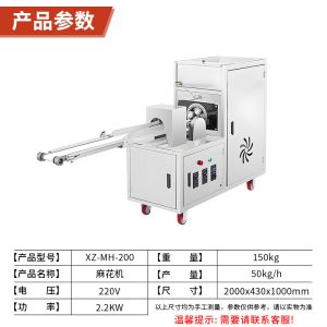名稱XZ-MH-200麻花機 電源220/380V 功率2.2KW 產量40-60斤/小時 尺寸1970X500X1000mm 重量90KG 規(guī)格可調 其他