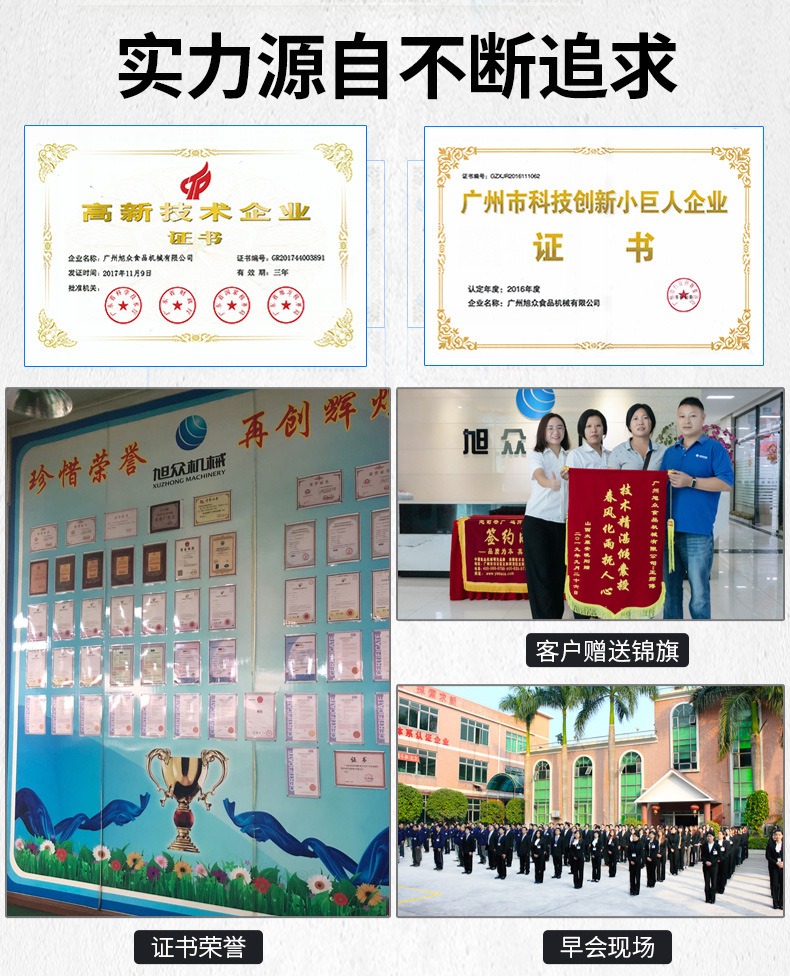 廣州旭眾食品機械有限公司是一家集科研開發(fā),生產設計,營銷服務為一體的現代化生產企業(yè)?,F代化生產車間,精湛制造技術,所產機械歷經市場重重考驗,不斷贏得海內外客戶的贊譽。
