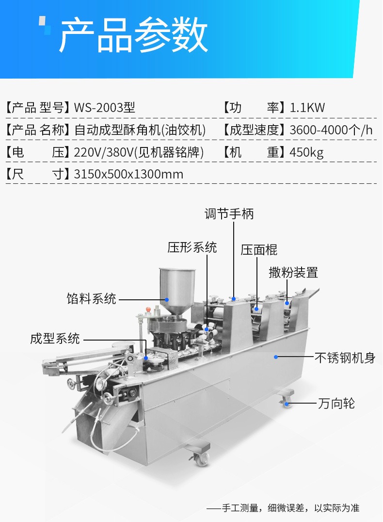 名稱自動成型油餃機 電源220V/380V(見機器銘牌) 功率1.1KW 產(chǎn)量3600-4000個/h 尺寸3150x500x1300mm 重量450kg 規(guī)格需要請聯(lián)系客服 其他