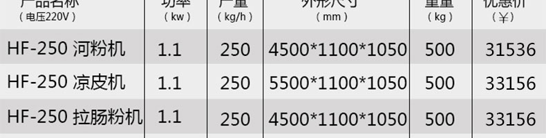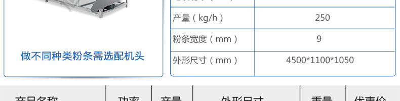 名稱SZ-HF-250涼皮機(jī) 電源220/380V 功率1.1/81kw 產(chǎn)量100/150/200/250kg/h 尺寸主機(jī)尺寸5500*1000*1050mm 外形尺寸5600*1200*1500mm 重量500kg 規(guī)格粉條寬度mm:4/6/8/10 其他