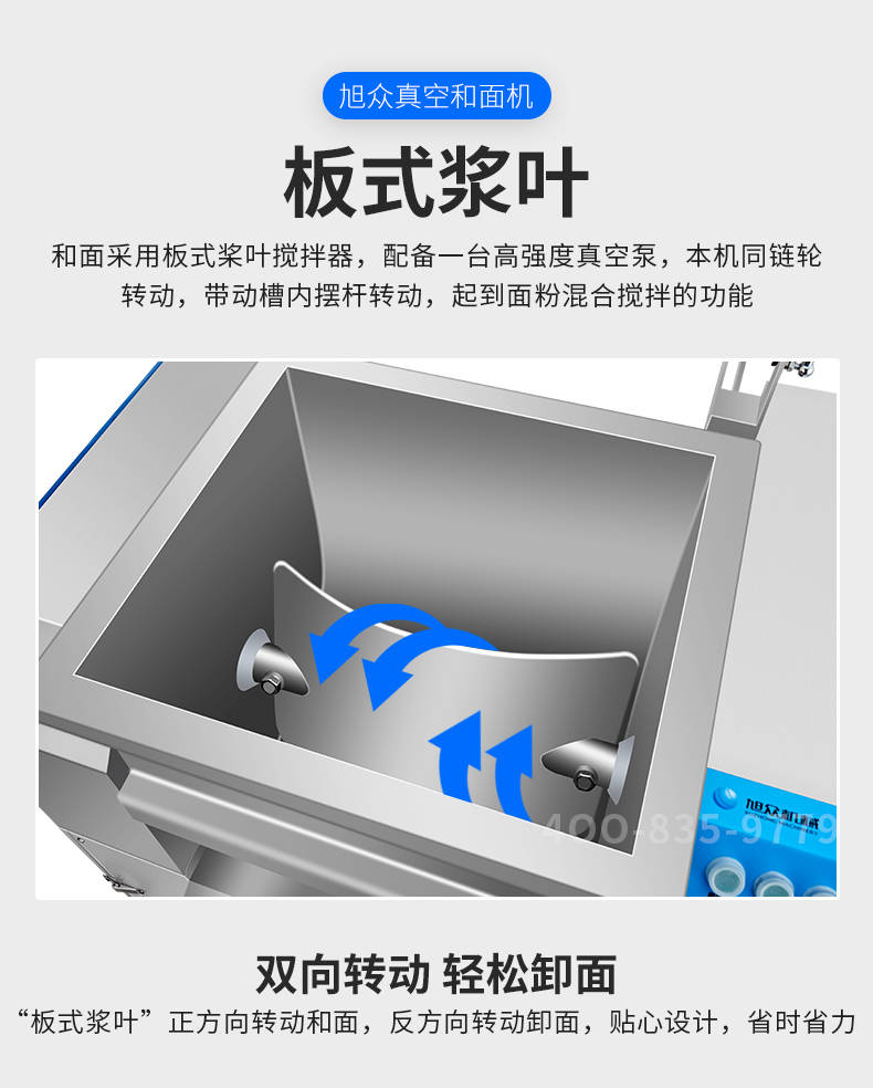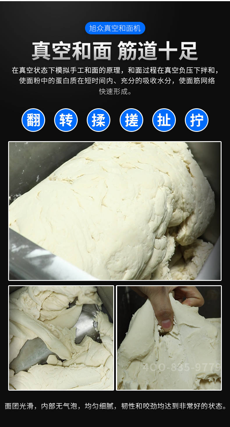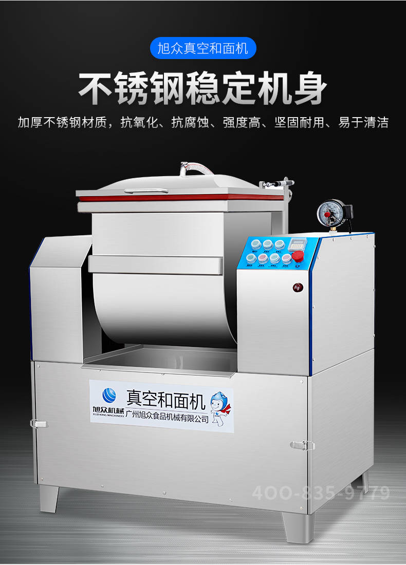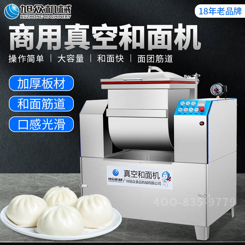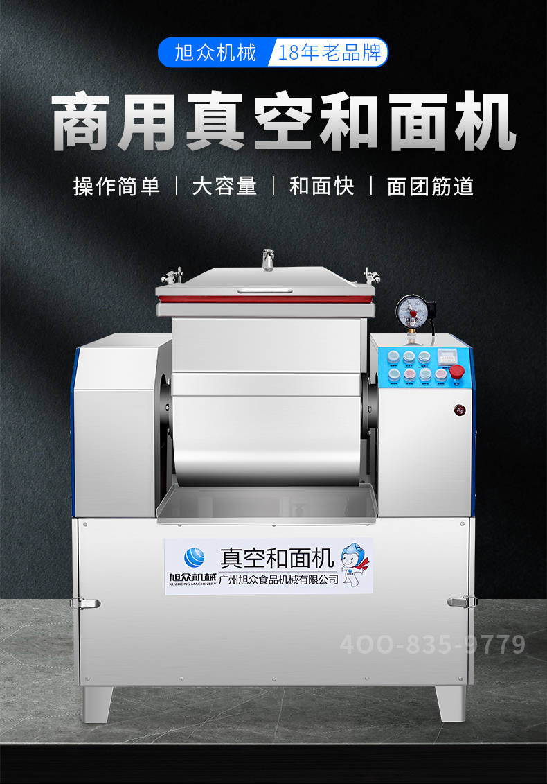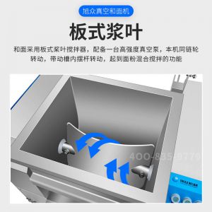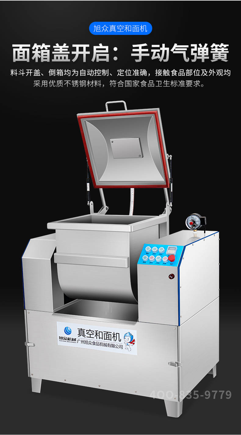 XZZK-25真空和面機,商用真空和面機,操作簡單、大容量、和面快、面團筋道。在真空狀態(tài)下模擬手工和面的原理,和面過程在真空負壓下拌和,使面粉中的蛋白質在短時間內、充分的吸收水分,使面筋網絡快速形成。