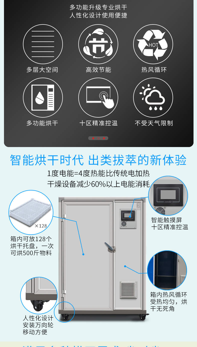 烘干除濕一體機(jī),烘干除濕體機(jī),智能觸屏精準(zhǔn)控溫?zé)犸L(fēng)循環(huán)均勻烘干次可烘干500斤,智能烘干時(shí)代出類(lèi)拔萃的新體驗(yàn),1度電能=4度,熱能比傳統(tǒng)電加熱。干燥設(shè)備減少60%以上電能消耗。