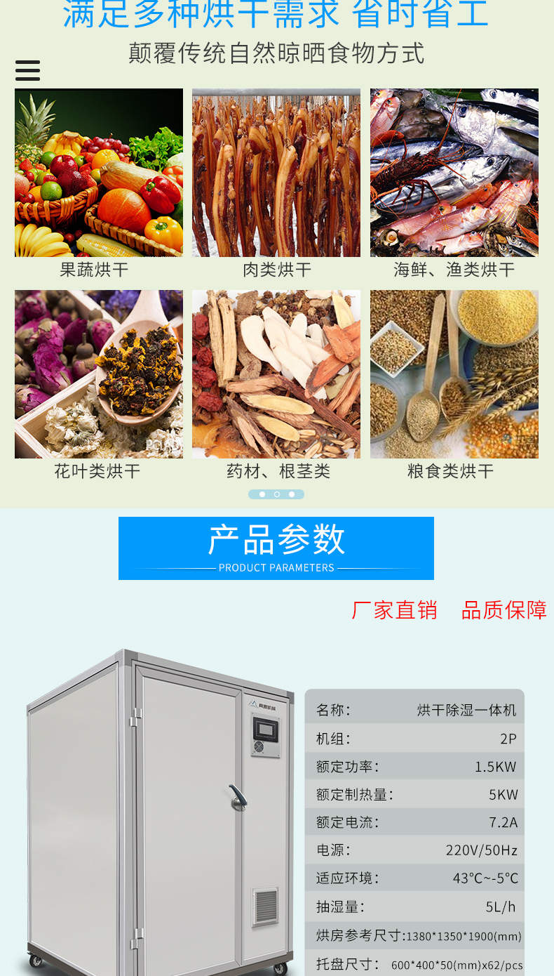 名稱(chēng)烘干除濕一體機(jī) 電源220V/50Hz 功率1.5KW 產(chǎn)量抽濕量:5L/h 尺寸烘房參考:13801350·1900(mm)托盤(pán)尺寸:600·40050(mm)x×62/cs 重量聯(lián)系銷(xiāo)售員 規(guī)格額定制熱量5KW、額定電流:7.2A 其他適應(yīng)環(huán)境43C~-5°C