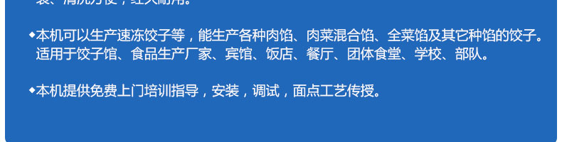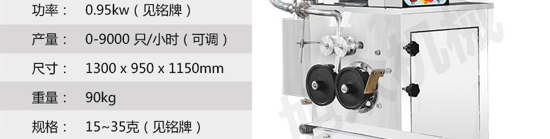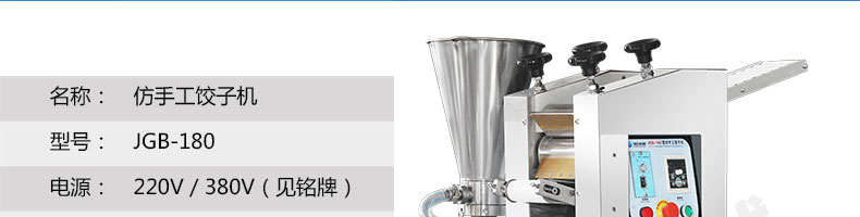 名稱JGB-180餃子機 電源220/380V(見機器名牌) 功率0.95kw 產(chǎn)量0-9000個/小時 尺寸外形尺寸1300*950*1150mm 重量90kg 規(guī)格15-35克/個 其他