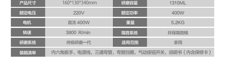 名稱(chēng)DCLQ40-廚房垃圾處理器 電源220V 功率0.4kw 產(chǎn)量 尺寸 重量5.2kg 規(guī)格 其他轉(zhuǎn)速3000R/min,研磨倉(cāng)容量1310ML