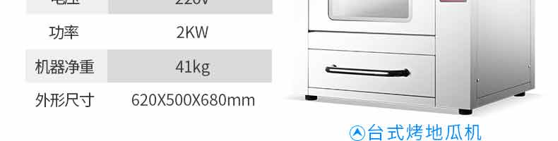 名稱立式烤地瓜機(jī) 電源220V 功率3.2KW,2kw 產(chǎn)量 尺寸783*470*1280mm,620*500*680mm 重量70kg,41kg 規(guī)格 其他