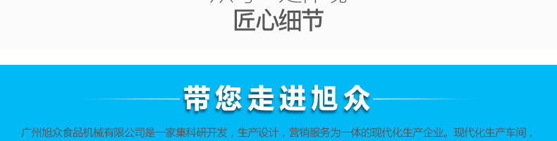 廣州旭眾食品機械有限公司是一家集科研開發(fā),生產(chǎn)設(shè)計,營銷服務為一體的現(xiàn)代化生產(chǎn)企業(yè)?,F(xiàn)代化生產(chǎn)車間,精湛制造技術(shù),所產(chǎn)機械歷經(jīng)市場重重考驗,不斷贏得海內(nèi)外客戶的贊譽。