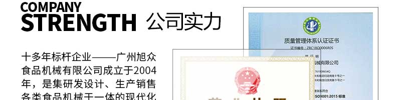 廣州旭眾食品機械有限公司是一家集科研開發(fā),生產(chǎn)設(shè)計,營銷服務(wù)為一體的現(xiàn)代化生產(chǎn)企業(yè)。現(xiàn)代化生產(chǎn)車間,精湛制造技術(shù),所產(chǎn)機械歷經(jīng)市場重重考驗,不斷贏得海內(nèi)外客戶的贊譽。