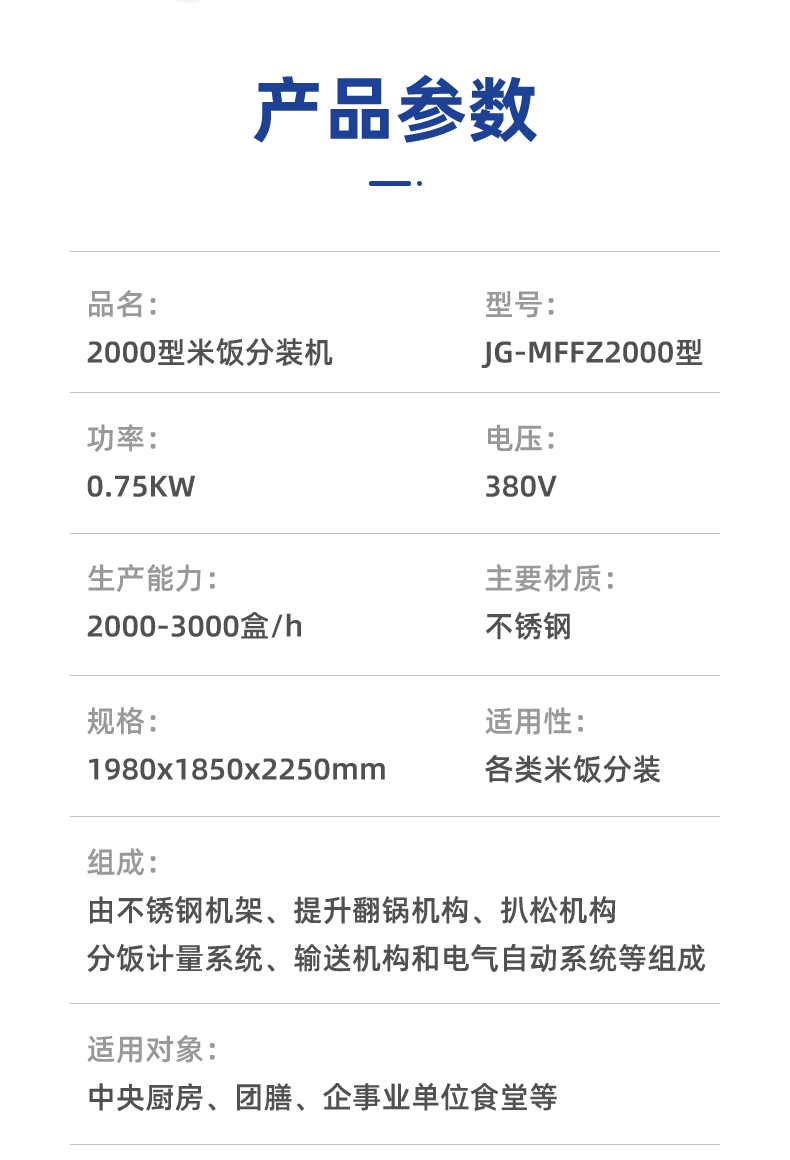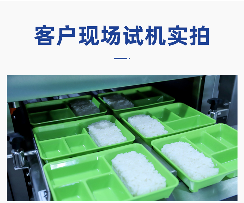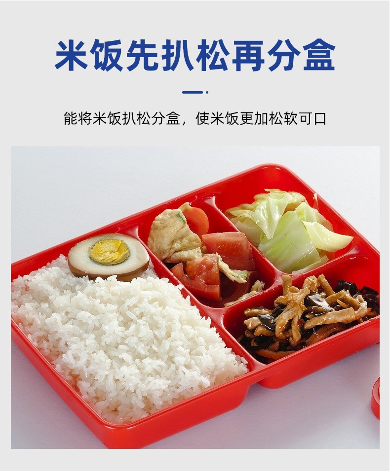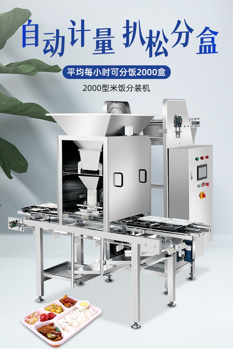 米飯分裝機(jī),適用多場合大型米飯加工中心、快餐公司、大型配餐中心企事業(yè)單位、學(xué)校食堂、釀造企業(yè)。米飯定量分裝,自動(dòng)完成分飯和計(jì)量,精準(zhǔn)飯量。米飯先扒松再分盒,能將米飯扒松分盒,使米飯更加松軟可口。