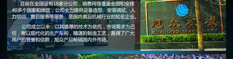 廣州旭眾食品機(jī)械有限公司是一家集科研開發(fā),生產(chǎn)設(shè)計(jì),營銷服務(wù)為一體的現(xiàn)代化生產(chǎn)企業(yè)?,F(xiàn)代化生產(chǎn)車間,精湛制造技術(shù),所產(chǎn)機(jī)械歷經(jīng)市場重重考驗(yàn),不斷贏得海內(nèi)外客戶的贊譽(yù)。