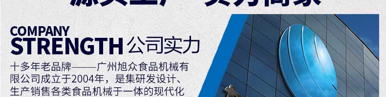 廣州旭眾食品機(jī)械有限公司是一家集科研開(kāi)發(fā),生產(chǎn)設(shè)計(jì),營(yíng)銷服務(wù)為一體的現(xiàn)代化生產(chǎn)企業(yè)。現(xiàn)代化生產(chǎn)車間,精湛制造技術(shù),所產(chǎn)機(jī)械歷經(jīng)市場(chǎng)重重考驗(yàn),不斷贏得海內(nèi)外客戶的贊譽(yù)。