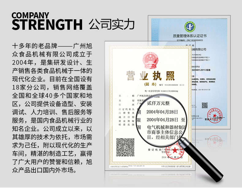 廣州旭眾食品機(jī)械有限公司是一家集科研開(kāi)發(fā),生產(chǎn)設(shè)計(jì),營(yíng)銷服務(wù)為一體的現(xiàn)代化生產(chǎn)企業(yè)?,F(xiàn)代化生產(chǎn)車間,精湛制造技術(shù),所產(chǎn)機(jī)械歷經(jīng)市場(chǎng)重重考驗(yàn),不斷贏得海內(nèi)外客戶的贊譽(yù)。