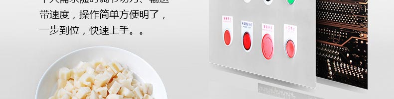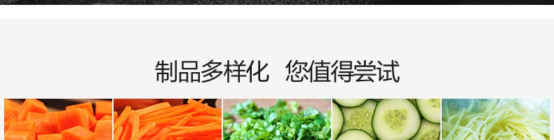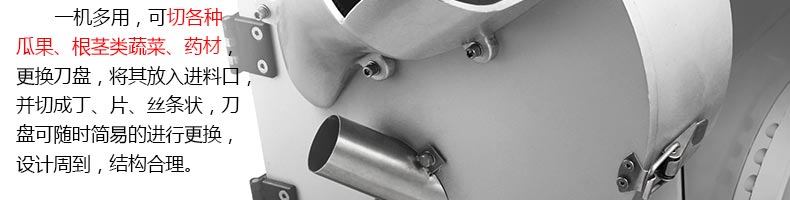名稱XZ-680A多功能切菜機 電源220/380V(見機器銘牌) 功率1.3kw 產量300-1000千克/小時 尺寸1220*530*1280mm 重量140kg 規(guī)格標配刀具尺寸:切絲:3mm,切片:3mm,切丁:10*10mm??蛇x的刀具尺寸:切絲:4、5、6mm 其他