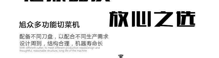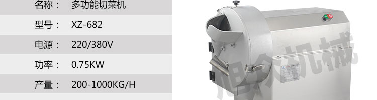 名稱XZ-682多功能切菜機(jī) 電源220/380V(見機(jī)器銘牌) 功率0.75kw 產(chǎn)量200-1000千克/小時(shí) 尺寸770*460*800mm 重量140kg 規(guī)格標(biāo)配刀具尺寸:切絲:3mm,切片:3mm,切?。?0*10mm??蛇x的刀具尺寸:切絲:4、5、6mm 其他