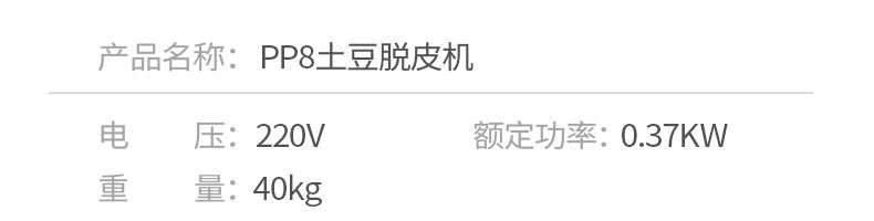 名稱PP8、PP15薯仔脫皮機(jī) 電源220v 功率0.37kw/0.75kw 產(chǎn)量8千克/次 / 15千克/次 尺寸480*480*780mm/500*500*860mm 重量52kg/66kg 規(guī)格 其他