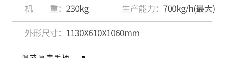 名稱350A壓面機(jī) 電源220v 功率2.2kw 產(chǎn)量755kg/h 尺寸1130*610*1060mm 重量230kg 規(guī)格壓面寬度:<350mm 其他