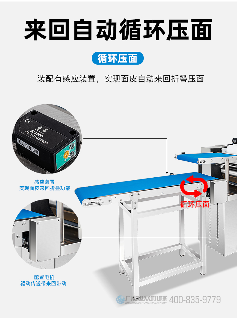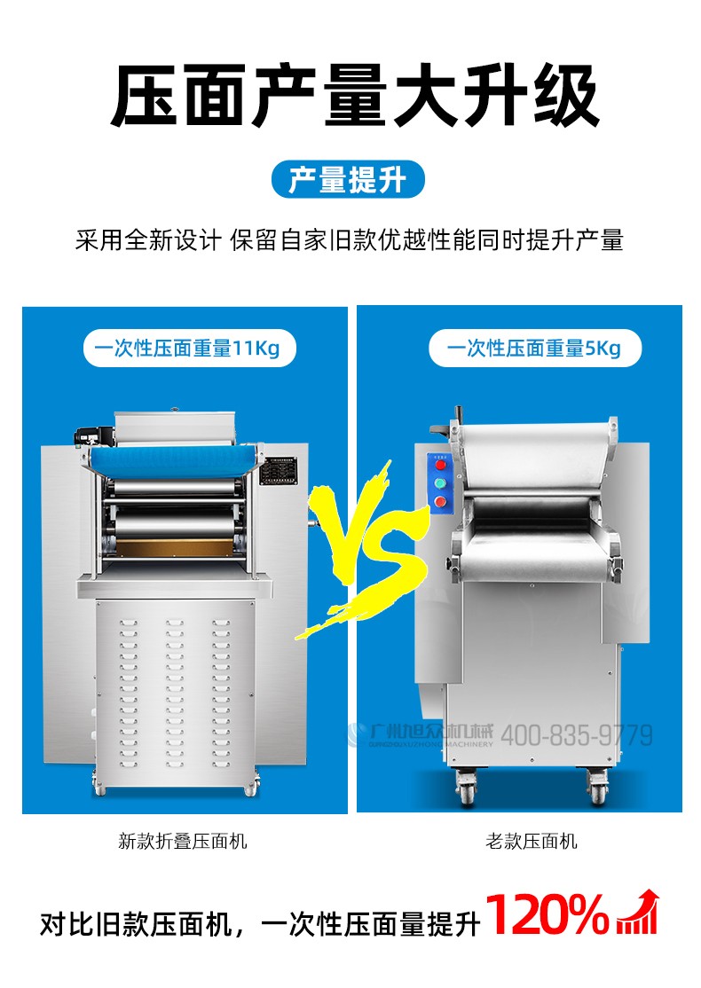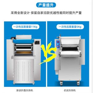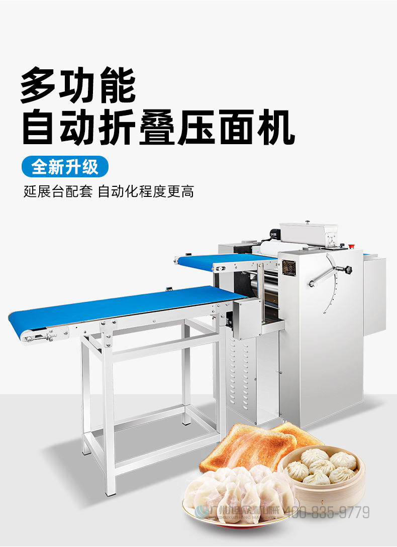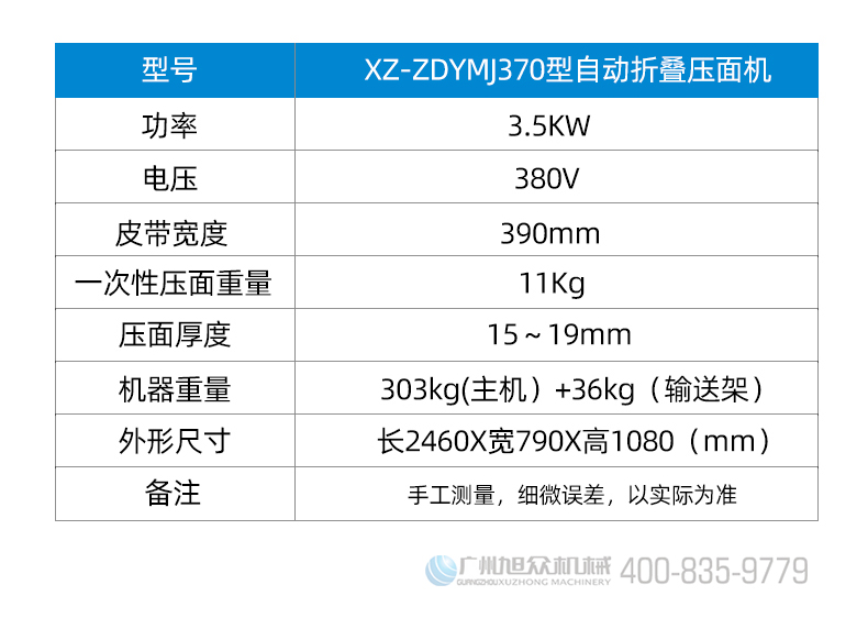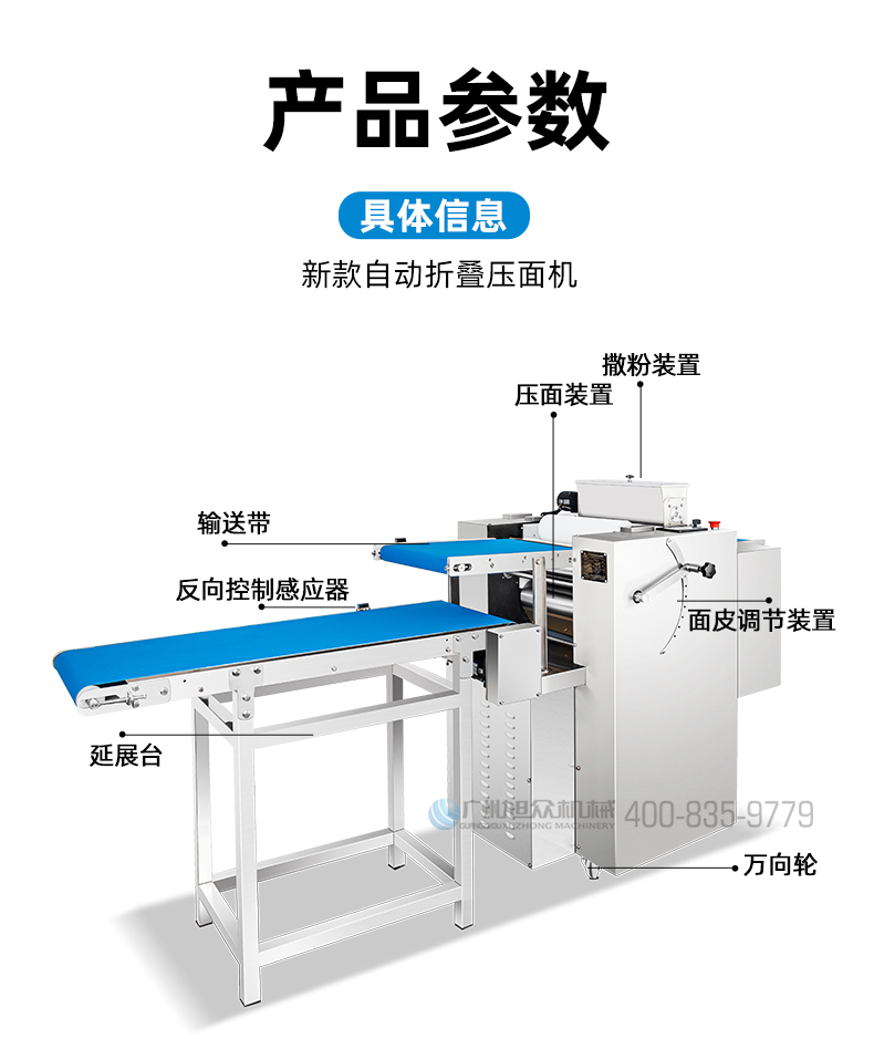 名稱XZ-ZDYMJ370型自動折疊壓面機(jī) 電源380V 功率3.5KW 產(chǎn)量一次性壓面重量11kg 尺寸2460X寬790X高1080(mm) 重量機(jī)器重量303kg(主機(jī))+36kg(輸送架) 規(guī)格壓面厚度15~19mm 其他皮帶寬度390mm