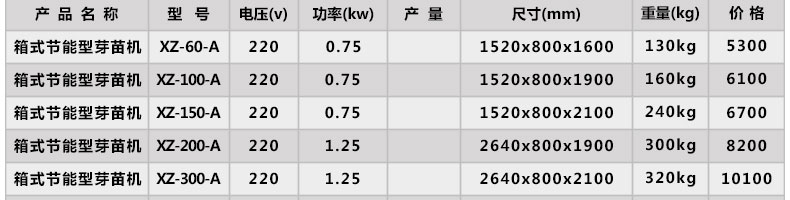 名稱XZ-60-A芽苗機(jī) 電源220V 功率0.75kw 產(chǎn)量 尺寸1520*800*1600mm 重量130kg 規(guī)格耗水量0.3day/t;日耗電1度;育苗箱6pcs 其他