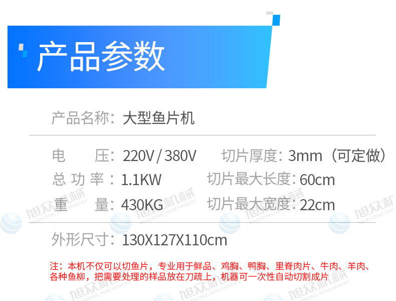 名稱(chēng)大型切魚(yú)片機(jī)(自動(dòng)進(jìn)料) 電源380V 功率2.1kw 產(chǎn)量1噸以上/日 尺寸130*127*110cm 重量430kg 規(guī)格切片厚度3毫米(可定制) 其他伺服電機(jī),可編程邏輯控制器