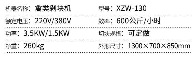 名稱XZW-130剁塊機(jī) 電源220/380V 功率3.5kw/1.5kw 產(chǎn)量600斤/小時 尺寸1300×700×850mm 重量260kg 規(guī)格 其他