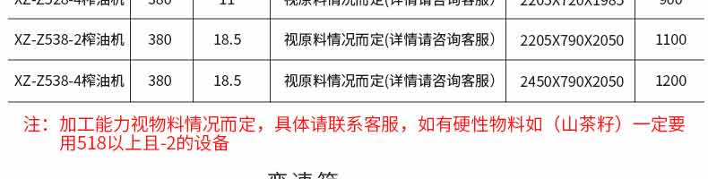 名稱XZ-Z518、XZ-Z528、XZ-Z538系列榨油機(jī) 電源380V 功率視型號(hào)而定7.5~18.5KW請(qǐng)下拉可查明細(xì) 產(chǎn)量視原料情況而定 尺寸視型號(hào)而定2030*720*1985mm~2450*790*2050mm請(qǐng)下拉可查明細(xì) 重量視型號(hào)而定700~1200KG請(qǐng)下拉可查明細(xì) 規(guī)格 其他