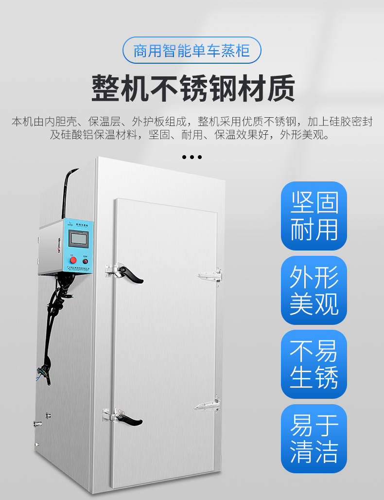 單車蒸柜,整機(jī)不銹鋼材質(zhì)本機(jī)由內(nèi)膽殼、保溫層、外護(hù)板組成,整機(jī)采用優(yōu)質(zhì)不銹鋼,加上硅膠密封及硅酸鋁保溫材料,堅固、耐用、保溫效果好,外形美觀。循環(huán)均勻發(fā)熱,專門用于發(fā)熱管干燒空氣,溫度任意調(diào)節(jié),讓食物口感怡到好吃